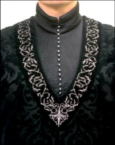 The next level down on both is a textured robe with a silver embroidered collar. The point of the collar has a 4-pointed star on it. This is a staple through Denethor's costumes. You can see the yoke of the undermost layer best here, as well.