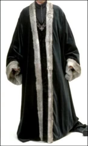I say costumes, because Denethor wears 3 different costumes through the trilogy, though they are all very similar looking. I don't have any pictures of his costume from TTT during the Osgiliath flashback, unfortunately. Ngila said that she wanted to dress Denethor in the most luxurios of silks and furs that she could. She really wanted to play up his vanity. On the left, is the costume Pippin and Gandalf first meet him in. On the right, is the costume he changes into after Faramir has fallen. The topmost layer is a velvet robe with fur collar and cuffs on the sleeves. He wears a robe very similar from the second one at Osgiliath, though the collar is changed.